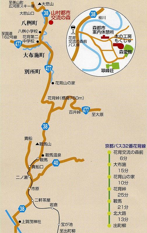 バスの場合 京阪出町柳駅から京都バス32号系統・広河原行きで約90分「花脊・交流の森前」で下車すぐ お車の場合 北山通堀川から北へ約30km,約1時間